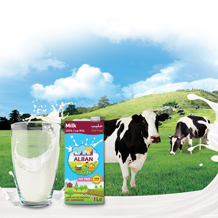 Alban Fat Free Milk 100% Cow Milk. Long Life Whole Milk, UHT, Homogenized. The product is conform with Austrian and European Union legislation. Produced for Alban Food Company Qatar.